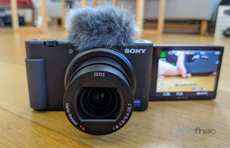 Pensé comme une caméra dédiée au vlog, le ZV-1 ne paraît toutefois pas étranger à qui connaît déjà l’écosystème de Sony. Il ressemble pour beaucoup au récent RX-100 VII, le compact expert de la marque, dont il conserve certaines caractéristiques et en abandonne d’autres. On y retrouve donc un capteur Exmor RS exploitant toujours la technologie de mémoire intégrée dite « stacked », d’un pouce et de 20,1 mégapixels, assorti toutefois d’une optique rappelant davantage des générations plus anciennes de RX100 : il s’agit en effet d’un 24-70 mm (fourni par Zeiss), formule polyvalente associée à une grande ouverture (f/1,8-f/2,8) [grande ouverture glissante f/1,8-2,8] favorisant les flous d’arrière-plan. Sony ne s’en cache pas : l’idée est ici de proposer une alternative matérielle aux vlogueurs utilisant les effets esthétiques (logiciels) de leur smartphone, et de manière simplifiée.