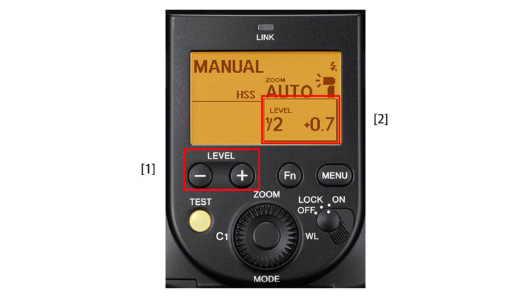 Un bouton indépendant de réglage de la lumière (« LEVEL -/+ ») a été intégré à ce flash. C’est une bonne idée, qui permet de régler directement la puissance ou d’ajuster la compensation sans avoir à passer par les menus.
