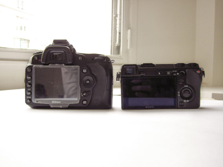 Et par rapport à un reflex ? A capteur et objectif équivalents (Nikon 35mm f/1/8), le NEX-7 maintient la promesse d’un hybride : il est bien plus petit (il y a un pare-soleil sur le Voïgtlander et pas sur le Nikon). Si on ne regarde que les boitiers, le nex-7 est plus fin et surtout moins haut. Rendez-vous sur camerasize.com pour faire la comparaison avec votre appareil actuel.