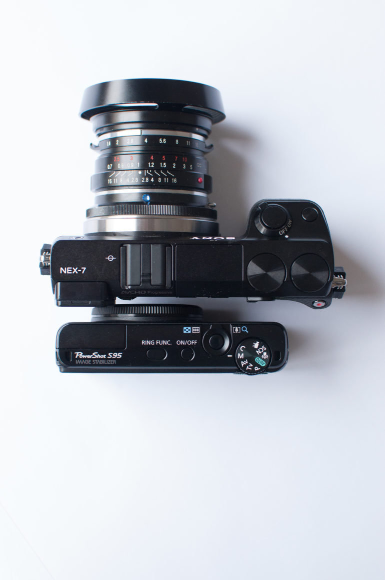 En profondeur, la poignée et l’objectif le rendent cependant plus encombrant, les objectifs NEX n’étant pas réputés pour leur taille réduite… C’est flagrant avec le 18-55mm ainsi qu’avec le 35mm. Ça l’est moins lorsque l’on compare le nex-7 avec le 16mm pancake et le Canon S95 avec l’objectif déployé.