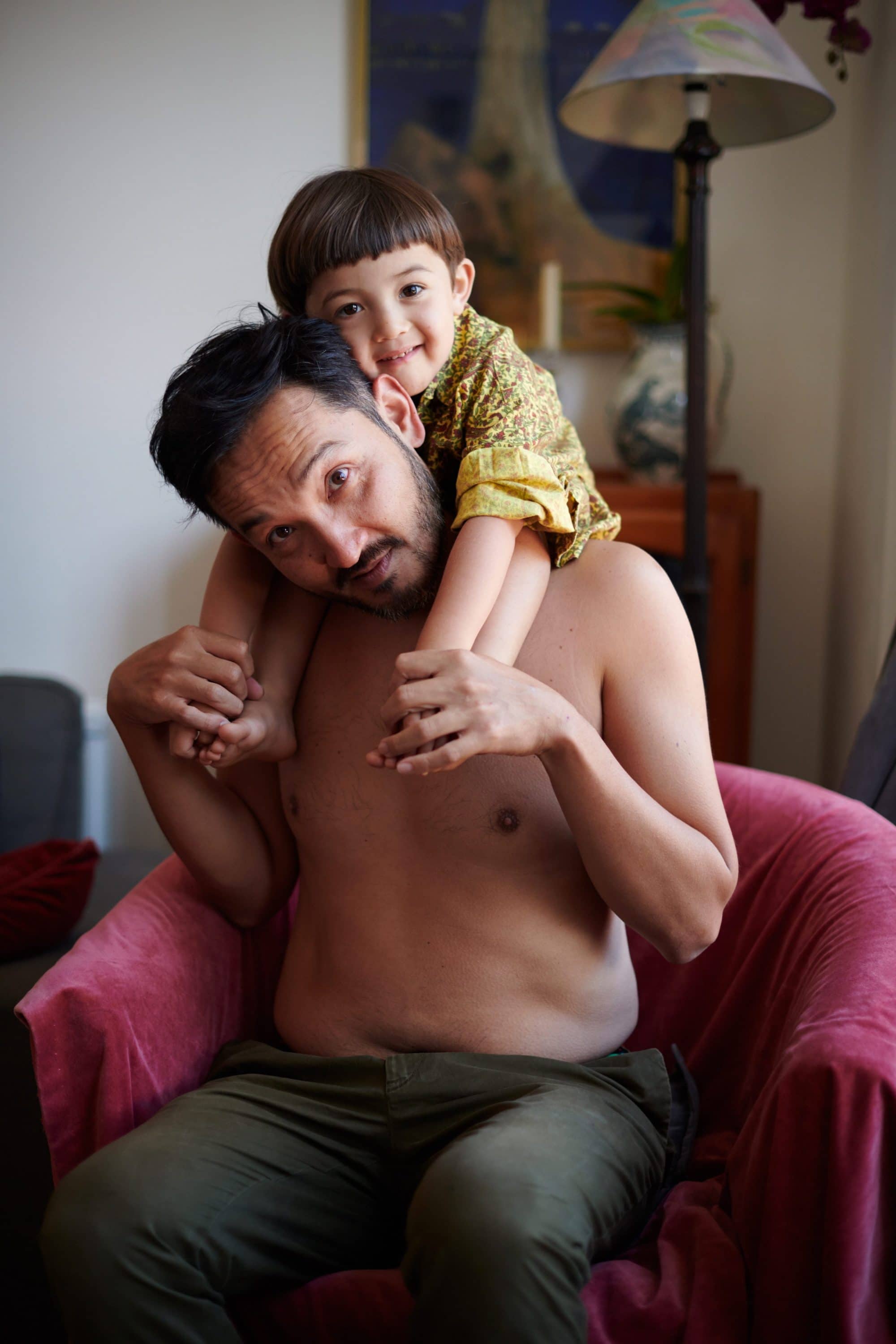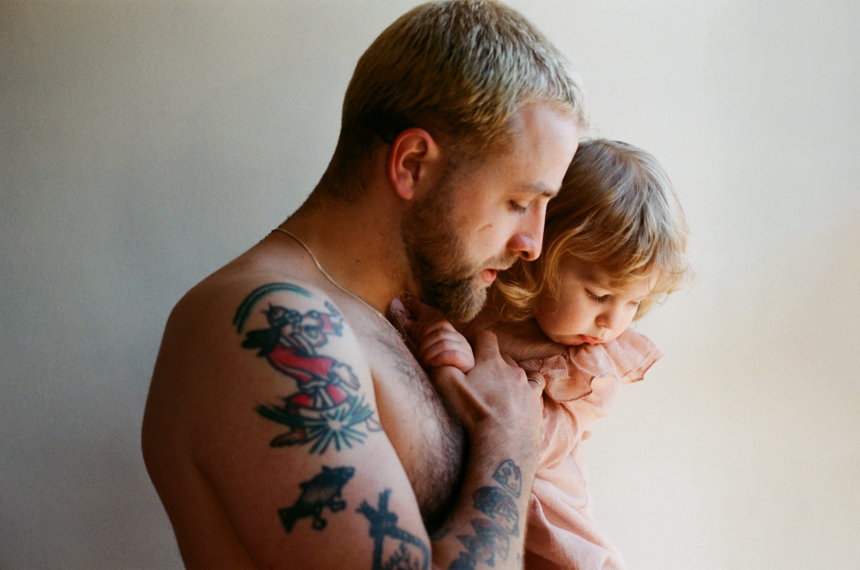 Alors que nos imaginaires concernant l’enfance se limitent souvent à une réflexion sur la maternité, la série redonne sa juste valeur au rôle de père, en l’éloignant des clichés. Les pères sont ici des figures de soin, à l’aise avec leurs émotions, en symbiose avec leurs enfants. La photographe voulait en savoir plus sur l’expérience de la paternité et a alors demandé à son compagnon d’écrire quelque chose à ce sujet. Puis le projet photographique s’est étendu.