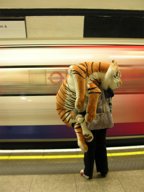 Cette femme se promenait tranquillement dans un jardin de Londres quand ce tigre est sorti d’un buisson. Elle a d’abord pris peur mais elle a vite remarqué qu’il était blessé et un peu sonné. Sans réfléchir elle a attrapé la bête pour la mettre sur son dos. Il fallait faire très vite et trouver un vétérinaire capable de s’occuper de cette énorme animal. Elle a tenté de prendre un taxi mais le chauffeur n’a pas accepté. La seule solution était le métro. C’est a ce môment qu’une femme a pris la photo. Cette vison était bien trop étrange pour ne pas l’immortaliser… On a jamais eu de nouvelle de la femme et son tigre.