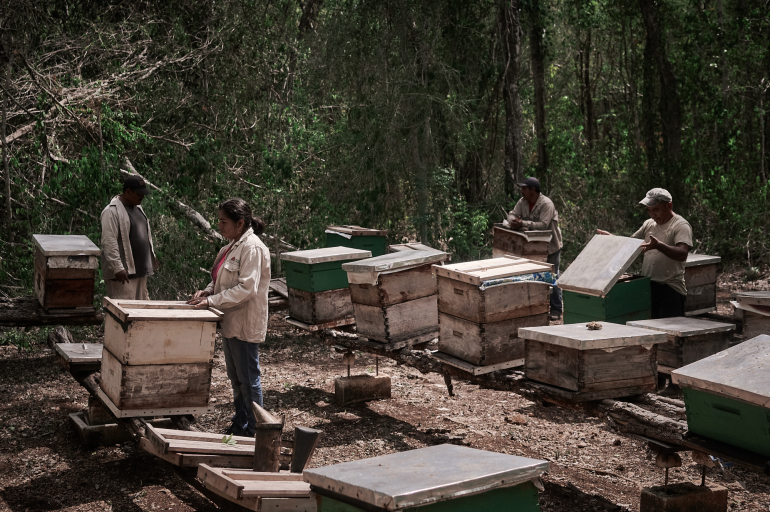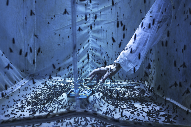Echoes of the Hive (Les échos de la ruche) de Mahé Elipe (France) montre les efforts des populations Maya du sud du Mexique pour préserver une espèce d’abeilles centrale dans leur religion et leur culture après un empoisonnement massif par des pesticides. La série Tropicalia de Jean-Marc Caimi et Valentina Piccinni (Italie) étudie comment la Sicile s’est adaptée au changement climatique et à l’augmentation de ses températures, en se concentrant sur les nouvelles pratiques agricoles développées par les fermiers et les scientifiques locaux, qui commencent à faire pousser plus de fruits tropicaux. En utilisant comme point de départ l’Objectif de développement durable des Nations-Unies d’éradiquer la faim dans le monde, Maurizio Di Pietro (Italie) montre la promotion des insectes comme source de nourriture dans la série Zero Hunger (zéro faim).