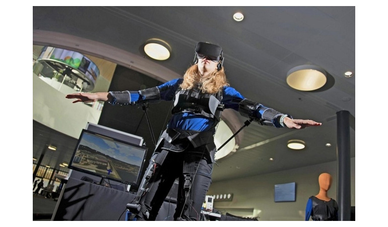 L’Ecole Polytechnique Fédéral de Lausanne (EPFL) a développé un exosquelette souple appelé FlyJacket, permettant, grâce à un « gant intelligent » et des capteurs placés sur les bras de se prendre pour un oiseau … pardon, d’incarner un drone. La gestion du tangage, du roulis et du lacet se gèrent en pivotant les hanches, le buste ou les bras. Le gant quant à lui permet via une gestuelle avec les doigts de lancer les moteurs, fixer des points d’intérêts, ou encore revenir à la maison.