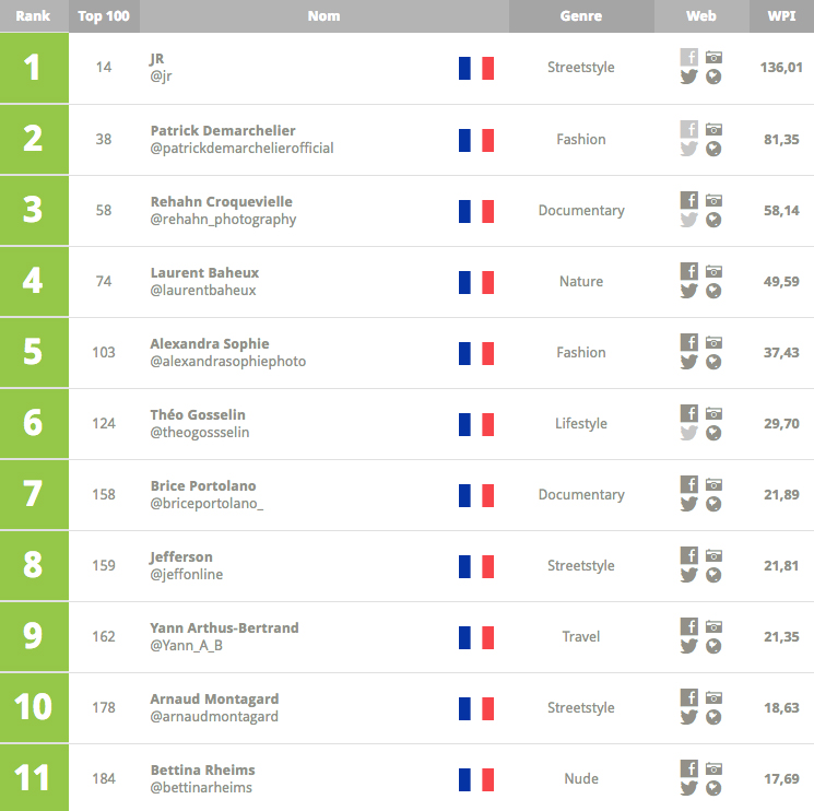 La France compte 4 représentant dans ce Top 100 (JR, Patrick Demarcheller, Rehahn Croquevielle et Laurent Baheux).