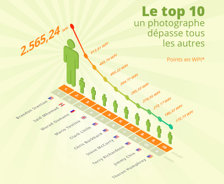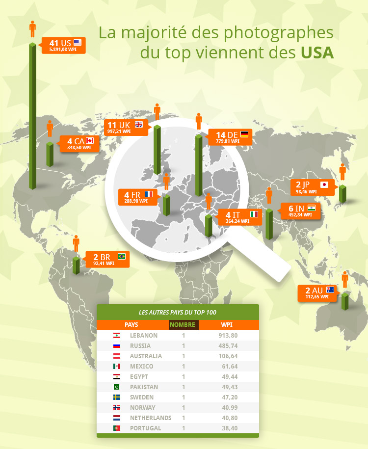 Un classement dominé par les photographes américains avec 41 représentants. Allemands et anglais complètent le podium avec, respectivement, 14 et 11 photographes.
