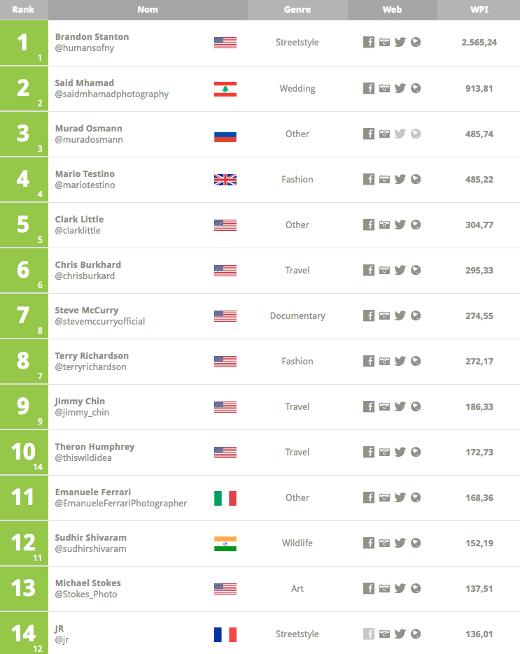 Pas de changement pour cette année 2017, Brandon Stanton (avec, entre autres, son projet Humans of New York) caracole à la première place de ce top 100. Le photographe américain dispose d’une audience pour le moins phénoménale avec plus de 25 millions de fans. C’est à la 14ème place que l’on retrouve le premier français. Il s’agit toujours de JR, un photographe et street artist.