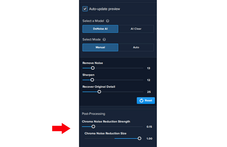 Deux nouveaux curseurs Chroma Noise font leur apparition. Ils permettent de régler l’intensité et la taille de cette réduction. Ils permettent de réduire le bruit chromatique, différent du bruit de luminance. Le fait de pouvoir doser et séparer ces différents types de bruit numérique est donc évidemment un plus.