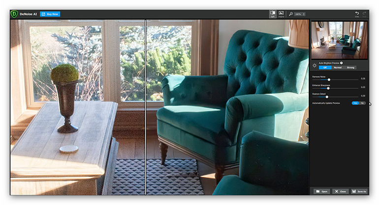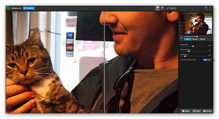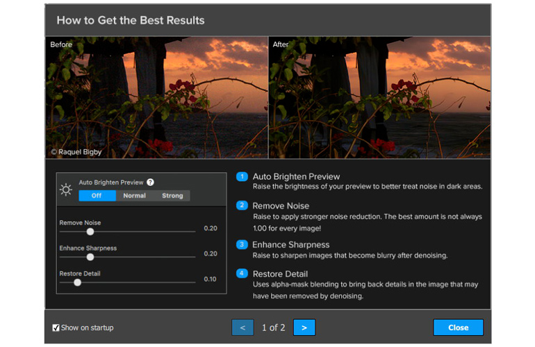 A l’usage, avec trois curseurs pour la réduction du bruit, la netteté, et les détails, il est extrêmement facile d’ajuster le rendu, avec une prévisualisation rapide et efficace des résultats dans différents modes (comparaison, curseur flottant, etc…).