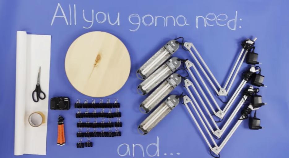 Nous devons ce tutorial aussi simple qu’efficace à Vladimir Matiyasevich. Dans une courte vidéo, il montre comment fabriquer un socle tournant, pour une bouchée de pain et très facilement. Voici les objets dont vous aurez besoin pour créer ce fameux socle :