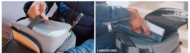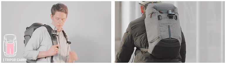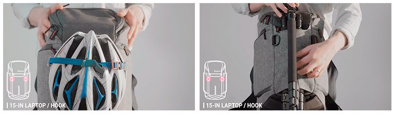 On trouvera les emplacements traditionnels pour un sac photo qui en plus des boîtiers et objectifs permettent d’emporter et séparer cartes SD, chargeurs, batteries, filtres, etc…On trouve aussi un système de fixation externe pour un trépied ou un casque de vélo.
