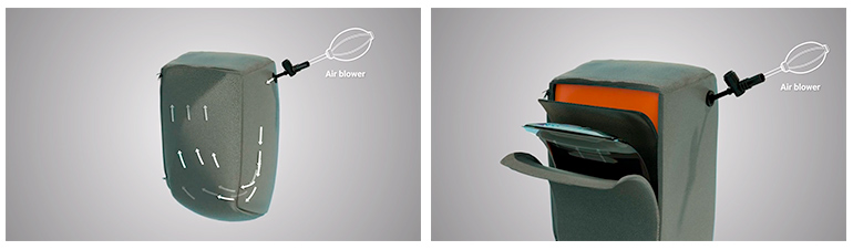 Cet insert agit comme une sorte d’airbag intégré que l’on gonfle à l’avance grâce à une pompe. Une entrée d’air sur le côté permet de connecter cette pompe.
