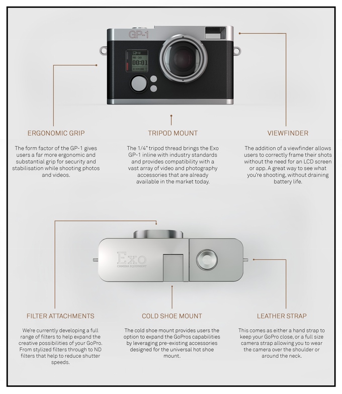 Derrière le nom Exo GP-1 se cache une coque en aluminium capable d’accueillir votre GoPro. Tout d’abord, elle dispose d’un viseur qui reproduit ce que voit la camera, ce qui permet donc un cadrage simple et précis pour les GoPro qui ne disposent pas d’écran. Nous retrouvons aussi un grip ergonomique pour faciliter la prise en main.