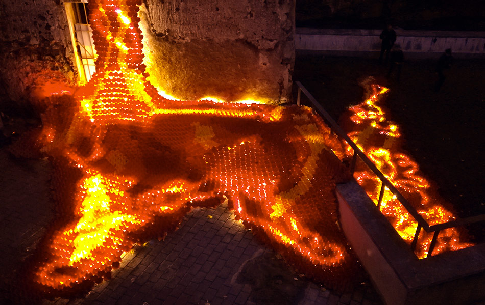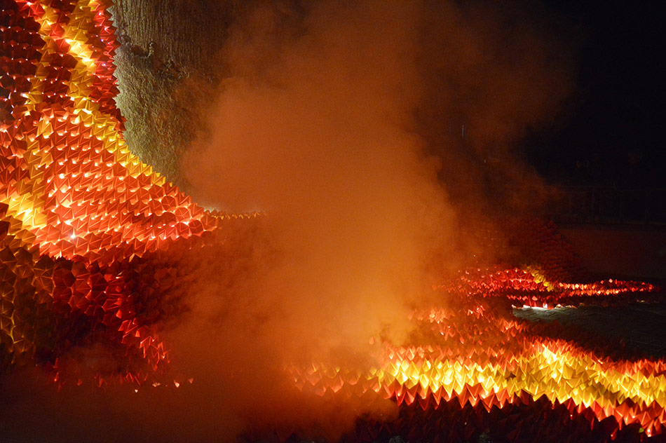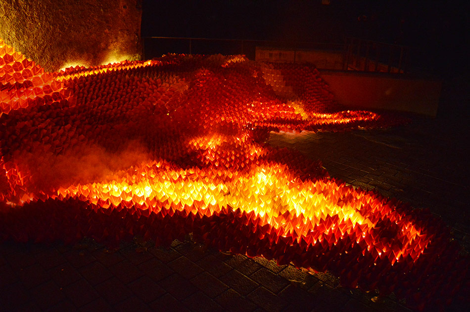 Le festival Lluèrnia rend hommage chaque année aux lumières et aux volcans endormis de la Catalogne. Feu et lumière sont à l’honneur dans les rues de la ville d’Olot, constellée d’installations par différents artistes. Un duo d’artistes, composé des architectes David Oliva (de l’agence SP25) et Anna Juncà, a rendu un hommage aux volcans de cette région en reproduisant un tapis de lave en origami, à l’apparence incandescente.