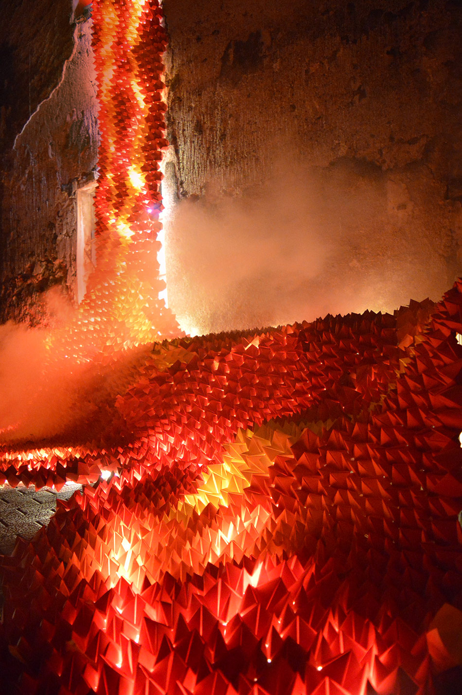 L’illusion d’optique est encore plus saisissante dans les photographies, qui semblent prises directement au sommet d’un volcan. Le flux de lave semble se déverser par un immeuble abandonné, en créant une atmosphère dantesque. 10.000 cocottes en papiers ont été nécessaires pour donner vie à ce faux cratère en pleine éruption.