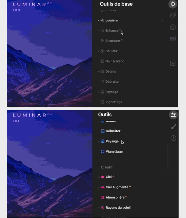 Luminar AI 1.0.1 utilise désormais un panneau d’édition mieux organisé et plus pratique. Les outils d’édition sont ainsi regroupés dans une seule et même liste. Le rangement par catégorie de couleur apporte aussi une plus grande clarté pour accéder aux outils Essentiels, Créatifs, Portrait et Pro. Le passage d’un onglet à un autre n’est plus nécessaire.