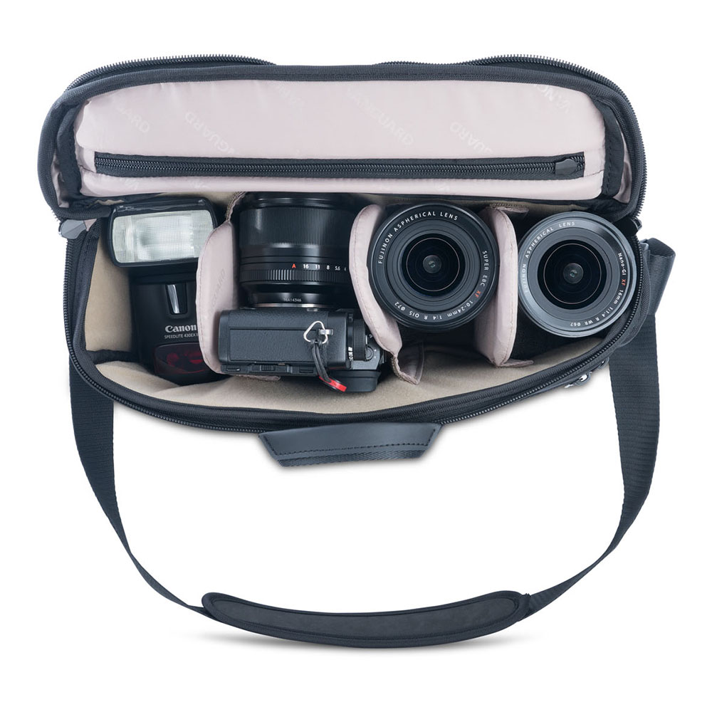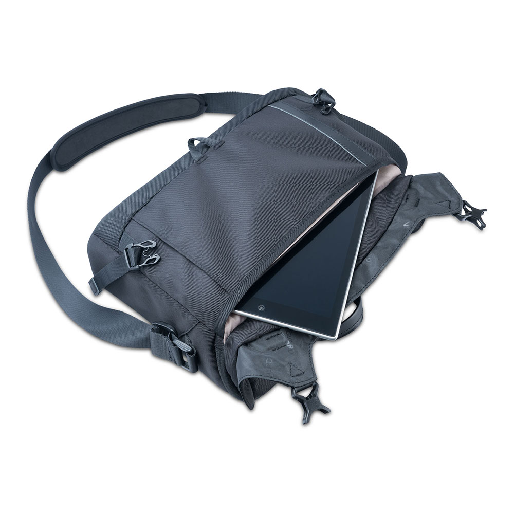Les trois sacs d’épaule présentés par Vanguard partagent l’esthétique sobre des sacs à dos décrits précédemment, mais le Veo Go 34M se démarque par une taille respectable et des rangements variés. Disposant de dimensions extérieures de 355 x 250 x 130 mm et d’un poids de 630 g, il possède ainsi un compartiment principal avec accès rapide, une poche avant destinée au rangement d’effets personnels et d’une tablette 9,7″, ainsi qu’un compartiment capable d’accueillir un trépied compact tel qu’un Veo 2 Go.