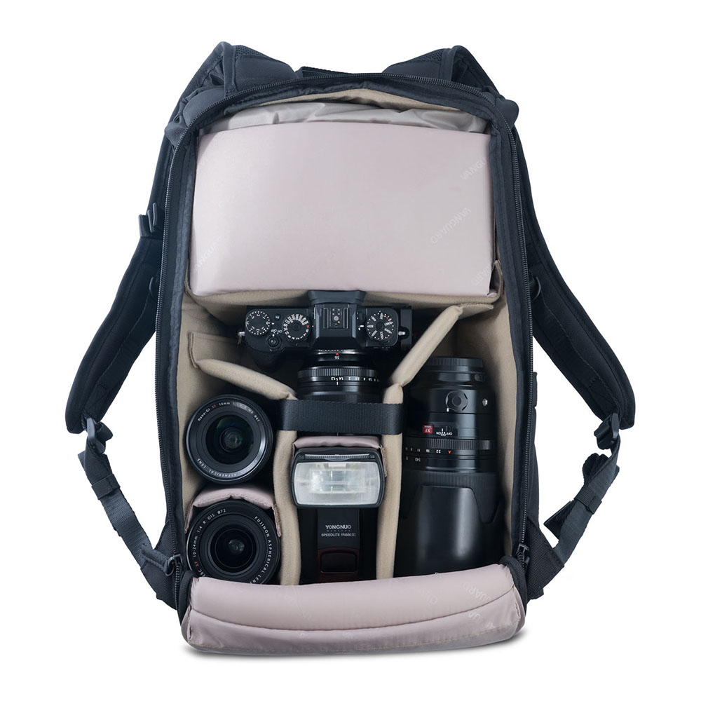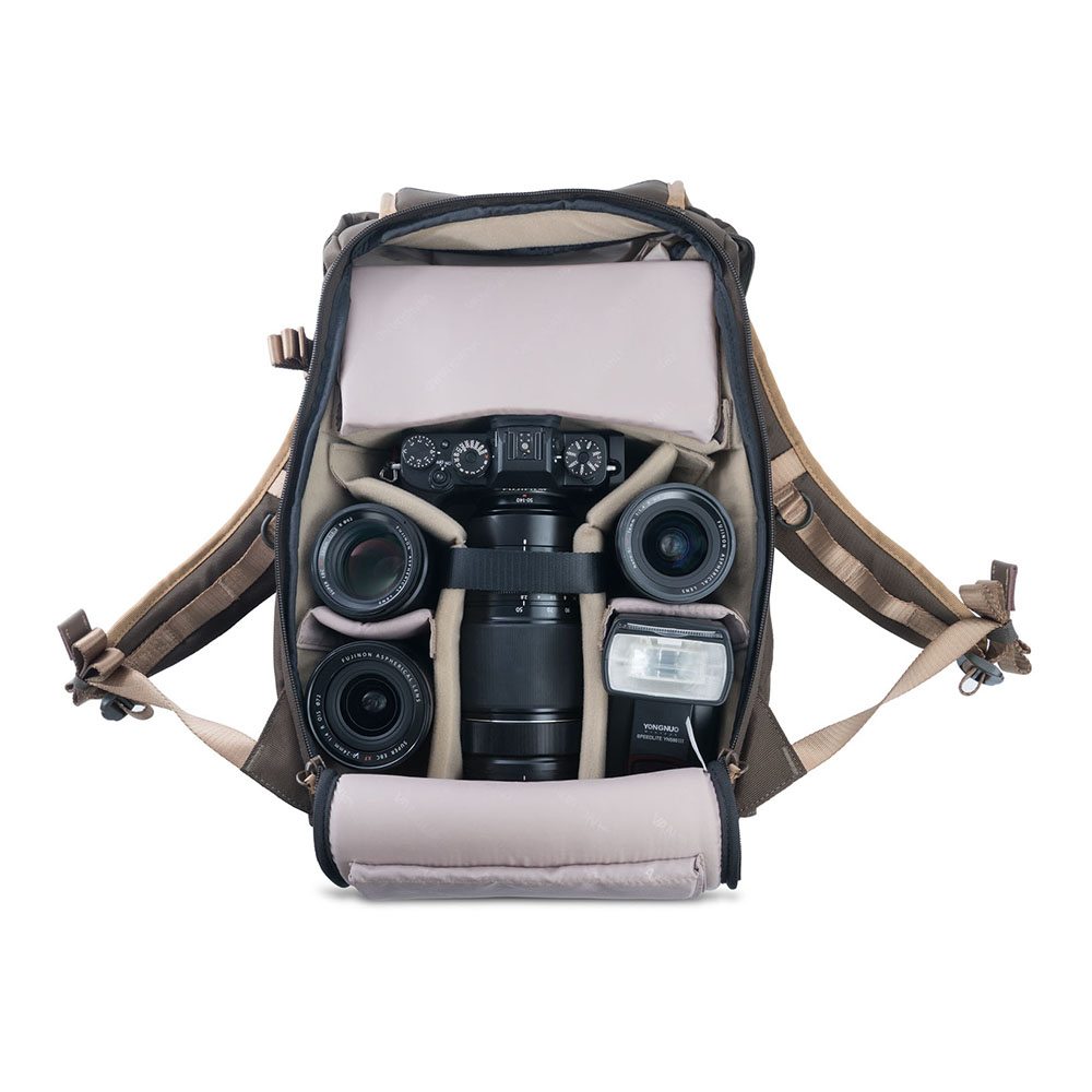 Située à l’arrière du sac, une large ouverture donne accès au compartiment pour ordinateur et au compartiment photo principal. Un compartiment amovible prend quant à lui place dans la partie supérieur du sac. Entre autres espaces de rangement, notons également la présence d’une poche avant, ainsi que d’une poche latérale capable d’accueillir un trépied.
