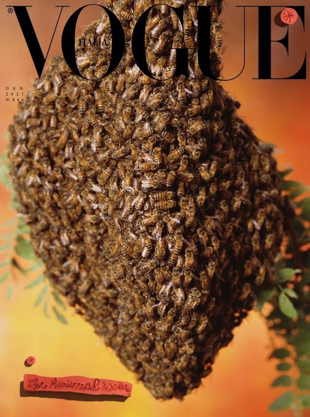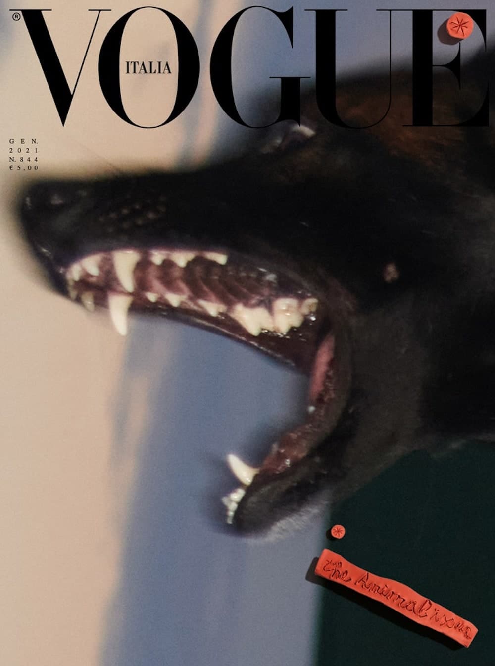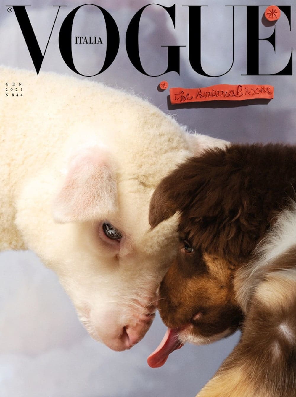 Chaque début d’année le magazine italien lance une couverture d’exception. Pour 2020, ce fut l’édition sans photos, composée uniquement de dessins, afin de réduire l’impact carbone du média. Cette année, le monde animal est mis à l’honneur et les modèles jouent un simple second rôle. En proposant un riche ensemble de couvertures, Vogue Italia a choisi de ne pas offrir une image confortable et domestique de la vie naturelle. Au contraire, ses portraits sont variés, ils mettent en exergue des animaux souvent brutalisés par l’industrie alimentaire ou des bêtes exprimant tout leur côté indomptable. Les images d’agneaux, de loups, de panthères et de souris visent en somme à défier l’illusion d’un monde anthropocentrique.