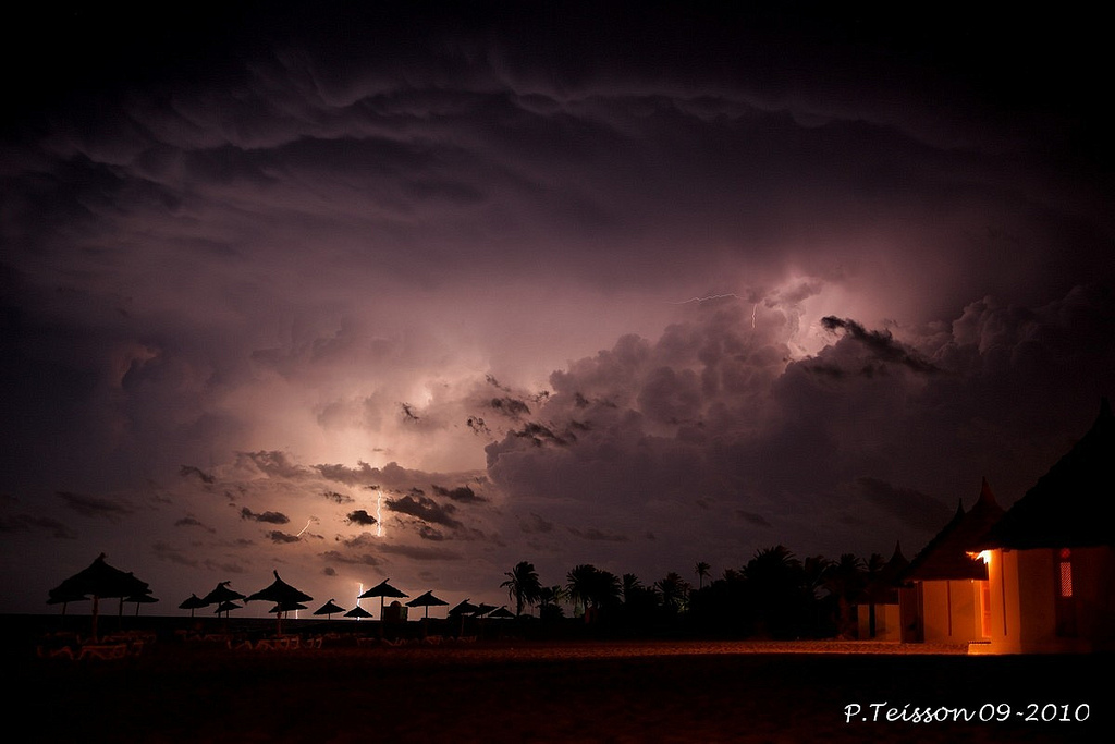 Un orage électrique au large. Le temps de courir au bungalow chercher le trépied, de s’installer et de passer plus d’une heure à admirer le spectacle.
