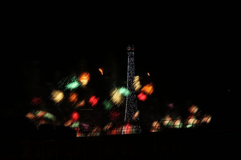 14 juillet, la Défense, sans pied. Mon 18-200 poussé à fond, dans un axe un peu ouvert entre les tours, je surprends ce feu d’artifice… et cet instant très « dessiné », mais garanti sans retouche !