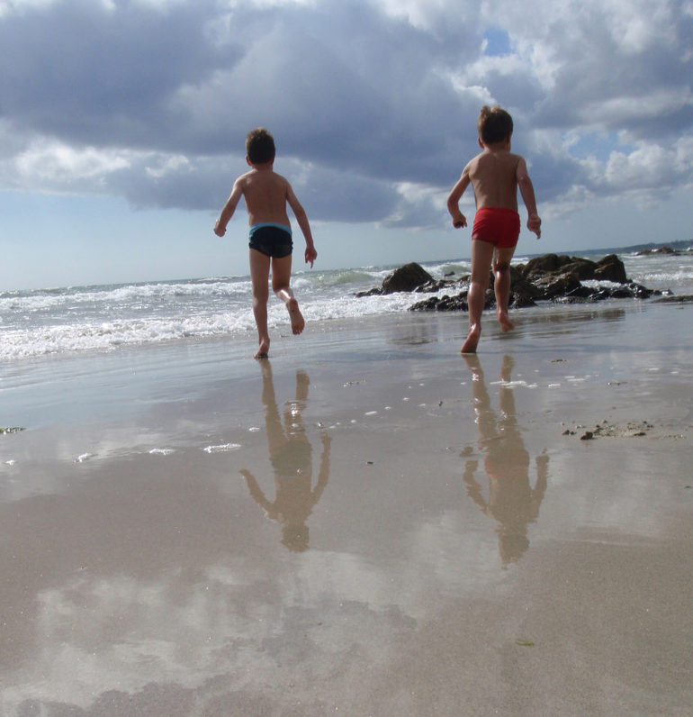 Fin d’après midi, fin de vacances, fin d’époques. Il ne fait pas spécialement beau, un vent froid, un rayon de soleil quand même et eux qui courent dans tous les sens sur cette plage pour essayer de faire des ricochets malgré les vagues. On entends qu’eux sur cette plage, comme toujours. Je les accompagne ; m’accroupis ; tiens l’appareil de travers au ras du sable en appuyant sur le déclencheur.