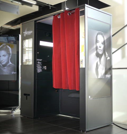 Il s’agit d’un studio photo fondé 1934 par Cosette Hartcourt, Robert Ricci et les frères Jacques et Jean Lacroix. Ce studio a acquis toute sa notoriété grâce à ses clichés de stars de cinéma en noirs et blancs. Malgré son statut de légende, Harcourt continue les expérimentations et s’est associé avec RP Solution, la société derrière Photo Plus, pour concevoir ces cabines offrant un concentré du studio : lumières, objectif, traitement.