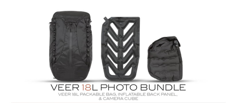 Si vous voulez simplement voyager avec un gros sac à dos, il faut pouvoir ranger votre sac photo à l’intérieur, sans prendre trop de place, lorsque vous n’en avez pas besoin. Le système VEER 18L est pensé pour cet usage. Composé du sac, et de deux éléments gonflables, il pourra être replié, un peu comme un K-Way, dans un espace très réduit, facile à ranger.
