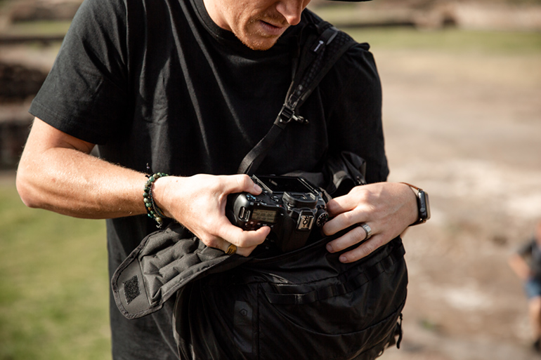 Une fermeture éclair latérale permet d’accéder directement à son matériel photo depuis le côté, sans avoir besoin de poser le sac. Cette approche « sling » qu’on retrouve sur beaucoup de sacs est toujours appréciable, surtout sur un sac de ce type.
