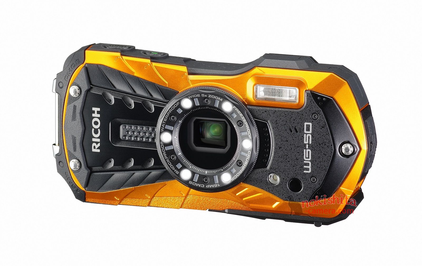 Côté optique, le WG-50 exploite un objectif 5x proposant une plage focale équivalente à du 28 – 140 mm en 24 x 36 avec une plage d’ouverture f/3,5-5,5. Une optique qui propose un mode macro avec une distance minimale de mise au point à 1 cm. Comme les générations précédentes, le Ricoh WG-50 bénéficie de six diodes LED disposées en cercles autour de l’objectif. Elles se destinent essentiellement à l’usage du mode macro.