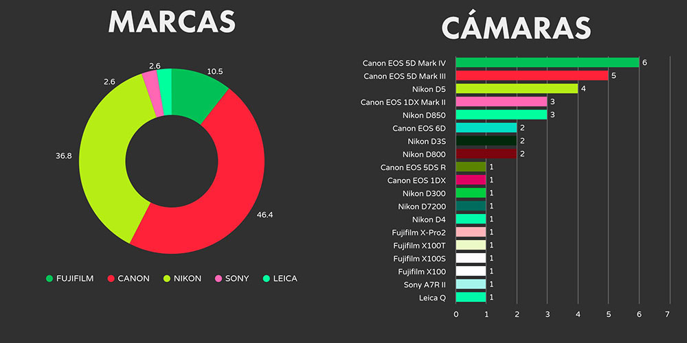 Les modèles de boîtiers les plus usités reflètent les tendances tout juste évoquées : sur le podium, on trouve les Canon EOS 5D Mark IV et 5D Mark III, ainsi que le Nikon D5. On note également avec intérêt la présence d’appareils accusant quelques années d’existence, tels que le Canon EOS 6D et le Nikon D3S.