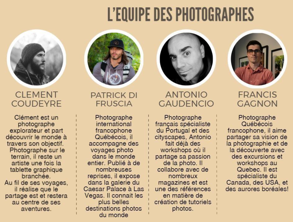 Encadrés par une équipe de photographes professionnels, les voyageurs peuvent choisir entre deux niveaux d’effort et de conditions climatiques, deux niveaux de confort, des thèmes variés (désert, neige et glace, aurores boréales etc.) et différentes durées de séjour en fonction des destinations et des envies.