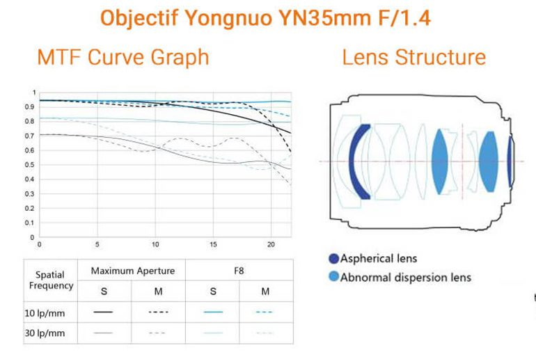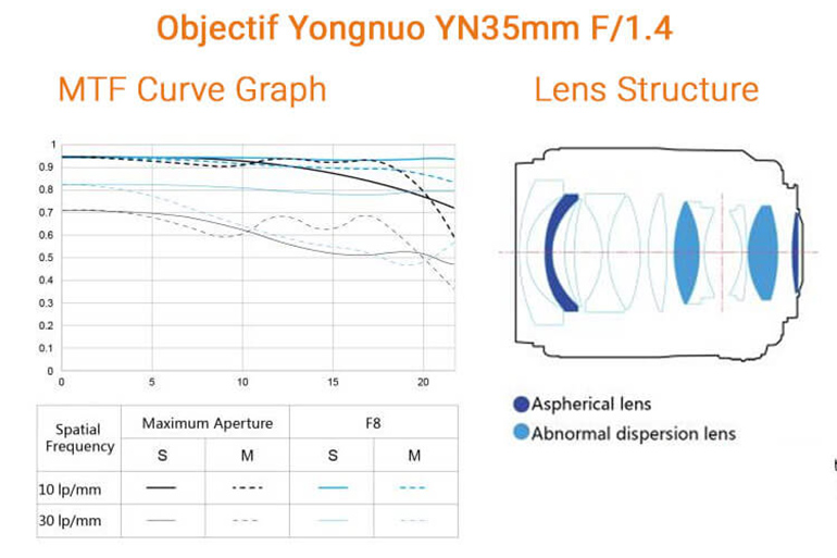 Le Yongnuo 35 mm f/1,4 AF s’appuie sur une construction tout en métal et pèse 810 grammes. Les contacts plaqués or de la baïonnette transmettent les instructions de mise au point et d’ouverture au boîtier et il sera possible de monter des filtres de 67 mm.